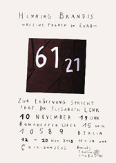 Henning Brandis hat mich gebeten, etwas über seine Kunst zu sagen. Das ist nicht so einfach, da das, was Henning macht, sich Diskursen entzieht. Aber auch Bilder malt Henning nicht im konventionellen Sinne des Wortes. Was mir schließlich in Bezug auf Hennings Arbeiten einfiel, war der Begriff der Sequenz, der auch im Mittelpunkt von Vladimir Propps Morphologie des Zaubermärchens steht. Wenn Henning alarmiert ist, oder sagen wir neutraler inspiriert, setzt er meist einen Anfangspunkt. Dieser Anfang könnte ein Ding sein, er ist oftmals ein Ding. Mit einem Fundstück, könnte man verallgemeinernd sagen, setzt bei Henning die inspirierte Reihe ein. Ich hatte Gelegenheit, ihn dabei zu beobachten. Den Anfang machte ein Rinderknochen. Henning legt seine Sequenzen oftmals wie eine Patience am Boden. Bald kam ein seltsamer Faden hinzu, den er auf Anhieb einen Rosenkranz nannte, der aber bei näherem Hinsehen auch die Zopffrisur eines Mädchens hätte sein können. Auffällig war nur, dass es jedes Mal aussah, als hätte Henning mit einem Tropfen Tinte gespielt bis der sich in lauter winzige Tropfen vervielfachte. All diese Gegenstände hatten die Tendenz sich zu verwandeln, vor allem das Ausgangsobjekt, von dem ich sprach. Kaum hatte es sich präsentiert, folgte eine ganze Reihe nach, die Henning bereits im Vorfeld als Sequenz kennzeichnete, indem er sie in griechische Buchstaben faßte. Eine Henningsche Reihe besteht demnach aus einem Ausgangspunkt, @, dem paarweise beta,/ gamma und dann delta / eta folgen. Das Dingalphabet kann nun, muß aber nicht, im Kopf des Betrachters ein Märchen auslösen oder besser den beschreibbar gewordenen Teil eines Märchens, dessen Rhythmus sich wiederholt wie ein Skatspiel oder eine Partie Schach.