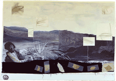 Eines Tages kam völlig überraschend ein "Bild" bei mir an, das mich begeisterte. Es trug schon eine "Legende": "warum ein Dzopön seinen Buttertee vergoß." Vielleicht war es auch wieder nur kollagiert aus Fundstücken wie die anderen, aber es war zugleich auch komponiert insofern Pinselstriche das Verschütten des Tees dramatisch inszenierten. Auffällig war ein schwarzer Stoffrand am unteren Ende des Bildes, sowie, zum Kontrast, helle Rechtecke, die auf den hellen Himmel aufgeklebt waren aber auch auf die dunkle Landschaft, die überdies durch Deckweiß am Horizont Schichten bildete. Diese Rechtecke wirkten so, als ob Wasser oder der Himmel selbst sich in ihnen spiegelte. Der Mönch lächelte auf eine Weise die schmerzlich wirkte. Wie heißt du hörte ich mich fragen und er antwortete Ich habe viele Namen Wo wohnst du Ich wohne an vielen Orten Seit wann gibt es dich Seit es Menschen gibt. Und er lächelte sein Lächeln, in dem Freude, Schmerz und Ekstase sich mischten. Der Dzopön saß wie ein Bootsfahrer in einer vertrockneten Landschaft, die nach der rechten Bildhälfte hin eingezäunt wirkte. Was er da mit der rechten Hand berührte könnte eine Gebetsrolle sein. Aber er betete nicht, dazu war er viel zu verzweifelt. Es wirkte so, als hätte die Katastrophe, seine Katastrophe, soeben stattgefunden, als habe er nicht nur sein Gefäß, sondern den Himmel zerbrochen und müsse nun die leuchtenden Scherben sammeln, ein Mönch, der aber nicht mit anderen Mönchen lebt, sondern allein, in einer leeren Landschaft unter einem zerbrochenen Himmel.